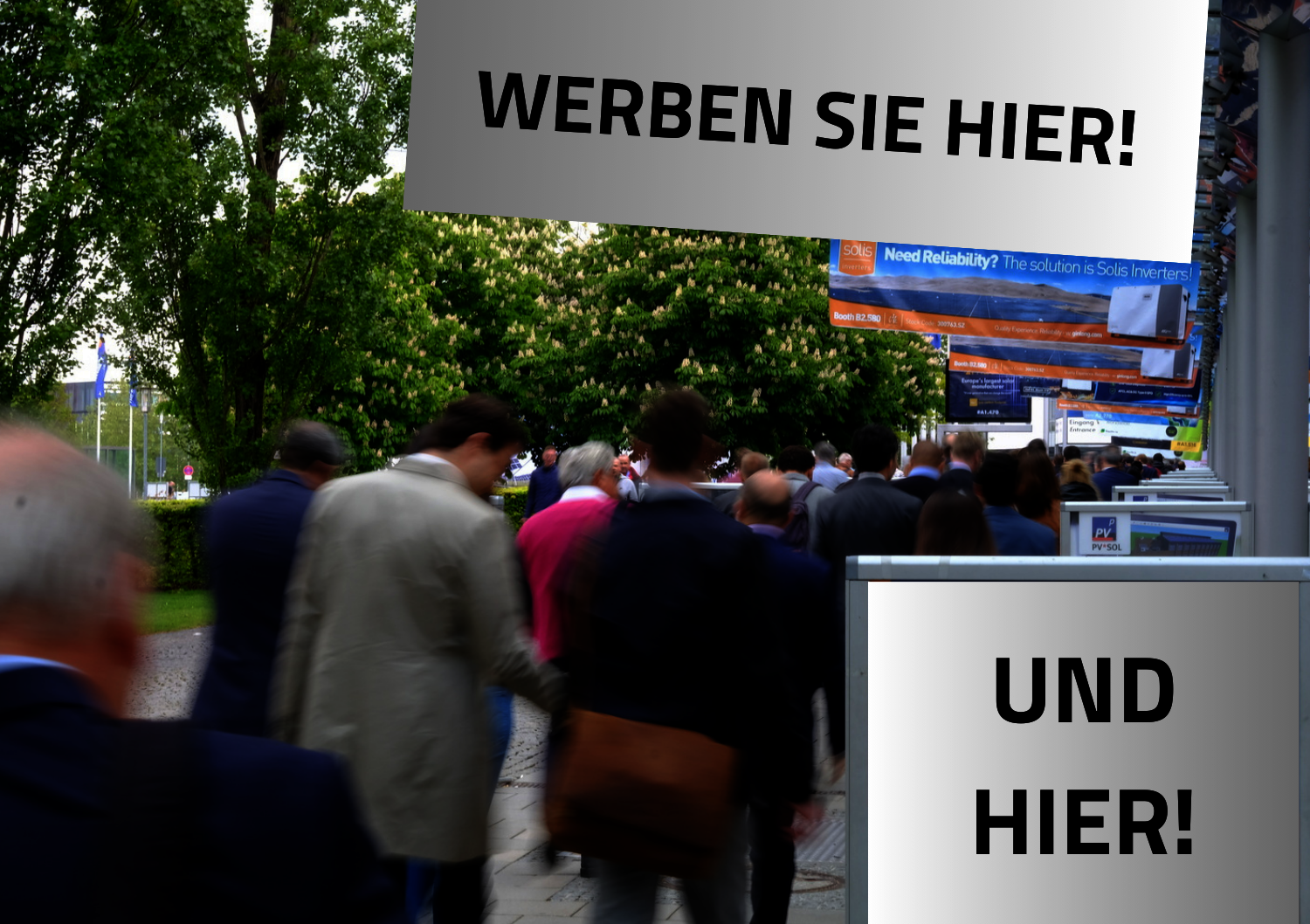 Die strategisch gut auf dem Gelände der Messe München platzierten Werbeflächen können Ihren Messeauftritt ideal ergänzen und auf Ihr Unternehmen und Ihren Stand aufmerksam machen: Werbebanner auf dem Weg zum Messegelände, Megaleinwände, Großbanner in den Eingangsbereichen oder Poster an den Eingängen zu den Messehallen u.v.m.