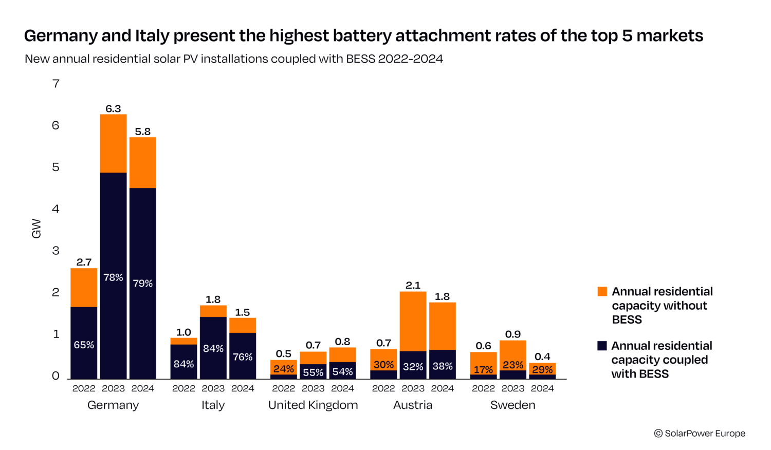 In 2024, batteries boosted the market value of solar electricity by on average 18 percentage points across four major European markets – Germany, Spain, Hungary, and the Netherlands. However, hybrid systems remain limited. Currently, only about 5 percent of the battery storage fleet is paired with solar, either as fully integrated hybrids or co-located systems, which represent just 1,1 GWh of capacity. In contrast, over 19 percent of the fleet operates as standalone storage, highlighting the significant untapped potential for solar-storage hybridization.