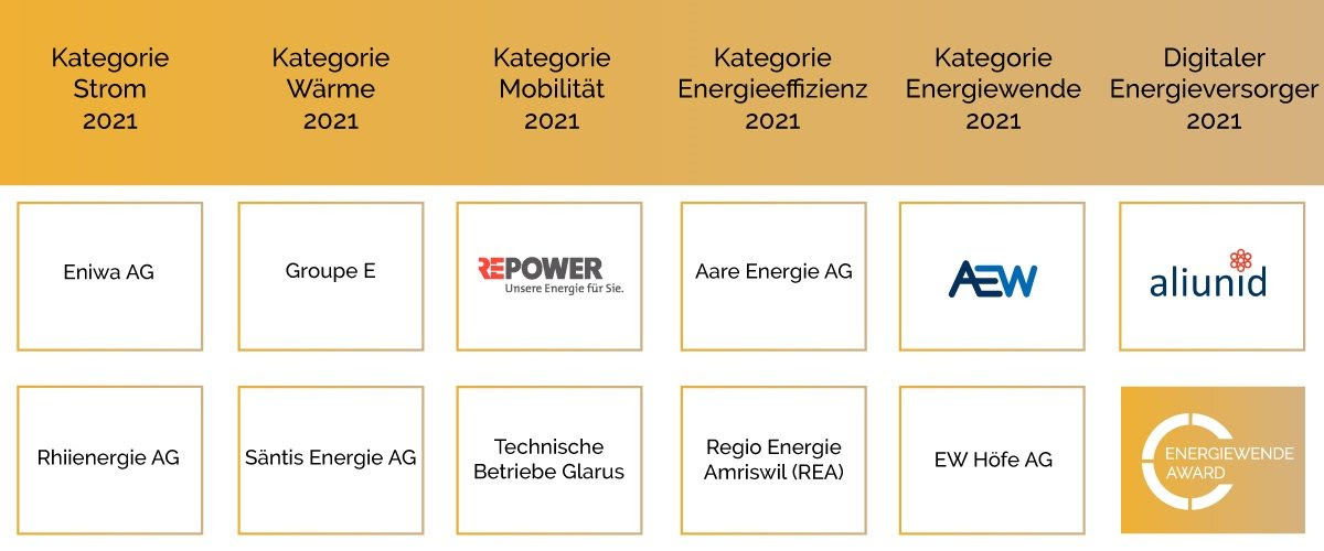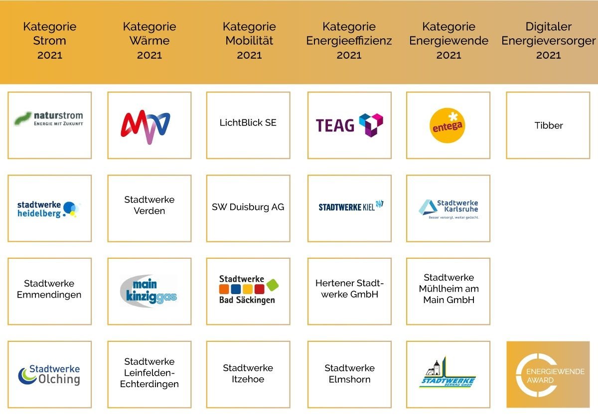 Die Initiatoren des Energiewende Awards The smarter E Europe, Europas größte energiewirtschaftliche Plattform, das DCTI Deutsches CleanTech Institut und EUPD Research freuen sich, die Gewinner des „Energiewende Awards“ für Energieversorger im Jahr 2021 (jeweils in alphabetischer Reihenfolge) in Deutschland, Österreich und der Schweiz vorstellen zu dürfen. Der Energiewende Award wird bereits im dritten Jahr in Folge von unserem Partner Vaillant unterstützt.