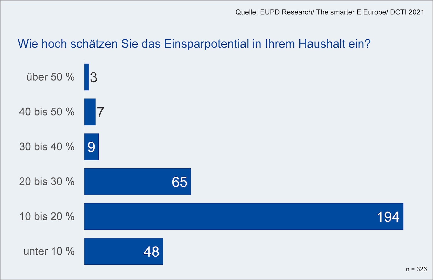 Zusätzlich zur Potentialbenennung stellt sich die Frage nach der Höhe der Energieeinsparungen. Die Befragungsergebnisse zeigen hierbei deutlich, dass das Gros der privaten Haushalte eine Energieeinsparpotential im Bereich zwischen 10 und 20 Prozent erwartet. Lediglich ein minimaler Anteil von 6 Prozent hält hohe Energieeinsparpotentiale von 30 Prozent und höher für realisierbar. Bei einem Stromverbrauch der privaten Haushalte in 2019 von 127 TWh (1) ergibt sich daraus ein volkswirtschaftliches Einsparpotential von 12 TWh für Deutschland.