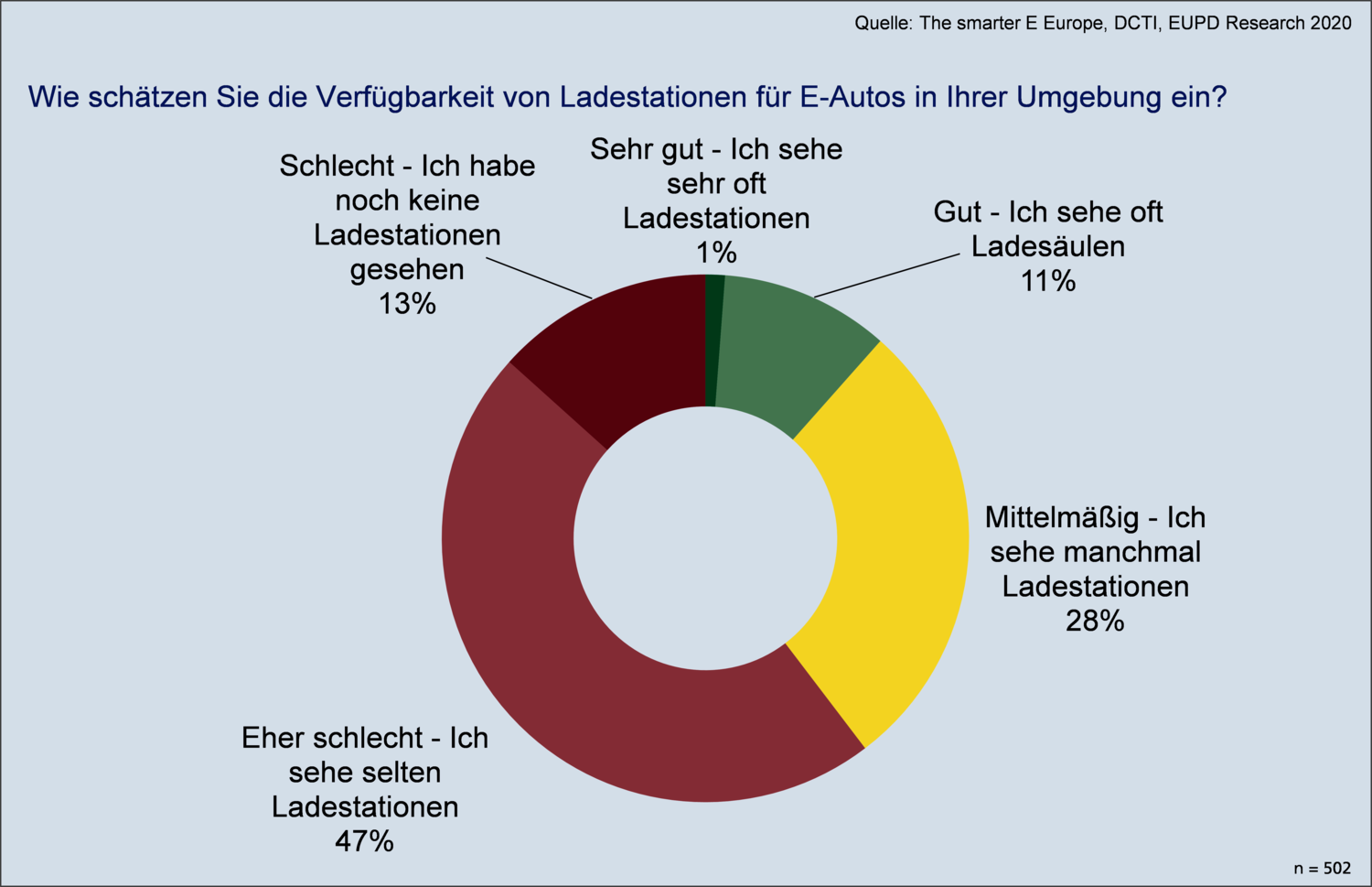 In einer aktuellen Befragung von gut 500 Hausbesitzern in Deutschland durch den Bonner Markt- und Wirtschaftsforscher EUPD Research wird der öffentlichen Ladeinfrastruktur für Elektroautos ein schlechtes Zeugnis ausgestellt. Hierbei bezeichnen lediglich zwölf Prozent der befragten Haushalte die öffentliche Ladeinfrastruktur für Elektromobilität in deren Umfeld als gut oder sehr gut. Mit 60 Prozent bezeichnen fast zwei Drittel der Befragten die Ladeinfrastruktur als schlecht oder eher schlecht.