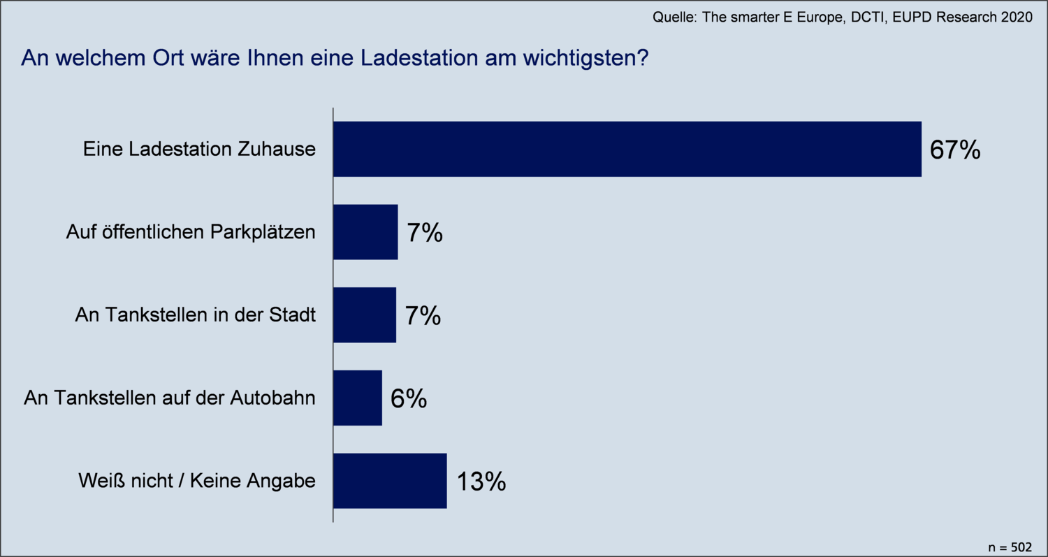 Weitere Ergebnisse der Hausbesitzerbefragung zeigen, dass dieser Mangel an öffentlicher Infrastruktur sich in einem erhöhten Interesse an privaten Ladestationen niederschlägt. Auf die Frage nach dem wichtigsten Standort von Ladestationen für Elektroautos geben 67 Prozent das eigene Zuhause an.