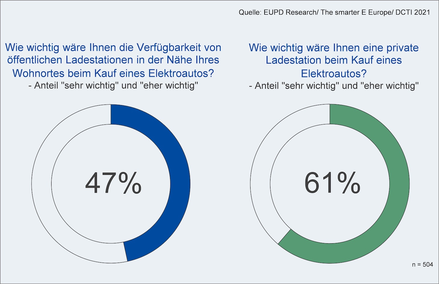 Eine aktuelle Befragung des Bonner Markt- und Wirtschaftsforschungsunternehmens EUPD Research unter gut 500 Hausbesitzern in Deutschland im Rahmen des Energiewende Awards unterstreicht die hohe Bedeutung der Ladeinfrastruktur im Fall der Anschaffung eines Elektroautos. Die Priorität der zukünftigen E-Autofahrer liegt hierbei auf einer privaten Ladestation. Knapp zwei Drittel der Befragungsgruppe geben an, dass eine private Ladestation „sehr wichtig“ bzw. „eher wichtig“ im Kontext eines eigenen Elektroautos ist. In Bezug auf die Verfügbarkeit einer öffentlichen Ladestation in Wohnortnähe belegen die Befragungsergebnisse lediglich bei knapp der Hälfte der Befragten eine höhere Relevanz.