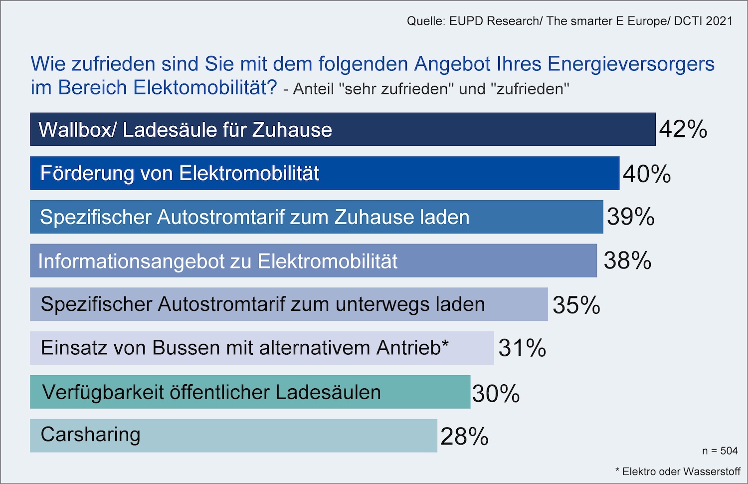 Als traditioneller Energielieferant besitzen die Energieversorger im Rahmen der Energiewende einerseits eine besondere Rolle für den Endkunden. Andererseits bieten sich den Energieversorgern vielfältige Optionen, sich mit neuen Produkten und Dienstleistungen in diesem Veränderungsprozess zu positionieren. Wie gut dies gelingt bzw. wie der Endkunde dies wahrnimmt, dokumentieren weitere Befragungsergebnisse zum Themenkomplex der Elektromobilität. 42 Prozent der befragten Hausbesitzer zeigen sich zufrieden mit dem Angebot an Wallboxen bzw. Ladestationen zum heimischen Laden der Elektroautos. Dieses neue Thema wird von vielfältigen Förderprogrammen und Informationsangeboten flankiert, welche ebenso auf 40 bzw. 38 Prozent Zufriedenheit bei den Befragten treffen. Spezifische Autostromtarife zum Zuhause Laden oder zum unterwegs Laden erreichen gleichermaßen eine Zufriedenheit zwischen 39 und 35 Prozent.