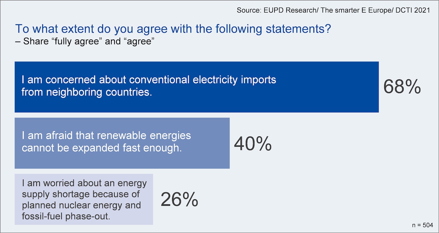 EUPD Research study findings show that about two thirds of private households are concerned about increasing electricity imports based on conventional energy sources. An analysis of German electricity imports in 2021 reveals a heterogeneous picture. With a share of 67 percent of nuclear energy in its own electricity mix, France is currently the second largest electricity exporter to Germany. The Czech Republic and Poland have a high share of energy from coal, but with nine and five percent respectively, they are rather smaller electricity exporters to Germany. The success of the German energy transition requires an appropriate expansion of renewable energies and storage capacities for their successful integration. The analysis is part of this year’s Energiewende (Energy Transition) Award, which is granted to excellent energy suppliers of the DACH region.