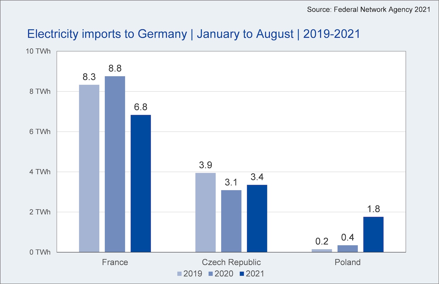 In addition to analyzing the status quo, the study examines the development of electricity imports to Germany. It reveals that French electricity imports between January and August in the pandemic-driven year 2020 were higher than in the same period of the previous year. Currently, the share of electricity imports from France to Germany is with currently two terawatt hours significantly lower than 2020. On the contrary, the Czech energy imports increased by ten percent between 2020 and 2021, after it was significantly lower between 2019 and 2020. A considerably strong increase of electricity imports to Germany is seen from Poland. Starting at a lower level, the Polish electricity import rose by 400 percent in 2021, compared to previous year.