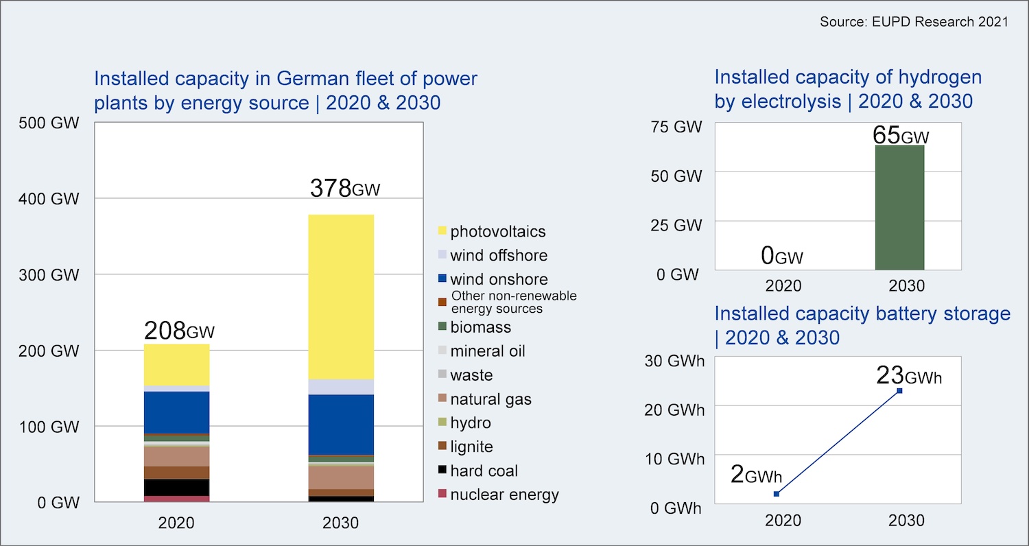 The success of the energy transition requires a full restructuring of the conventional fleet of power plants to renewable energies. Because of an increased electricity consumption for the electrification of mobility and heat generation, as well as lower full load hours of renewable energy systems, the installed capacities in Germany have to nearly double within the current decade. While conventional power plant capacities decreased by ca. one-third, the installed wind energy production (on- and offshore) increased to 100 GW. The by far strongest growth is to be expected for photovoltaics, which may quadruple between 2020 and 2030 to 217 GW. For the integration of the future fleet of power plants with a dominant share of solar energy and wind power, the restructuring and expansion of the electricity grid is as important as building large storage capacities for the short-term storage, by means of battery storage as long-term chemical storage of hydrogen.