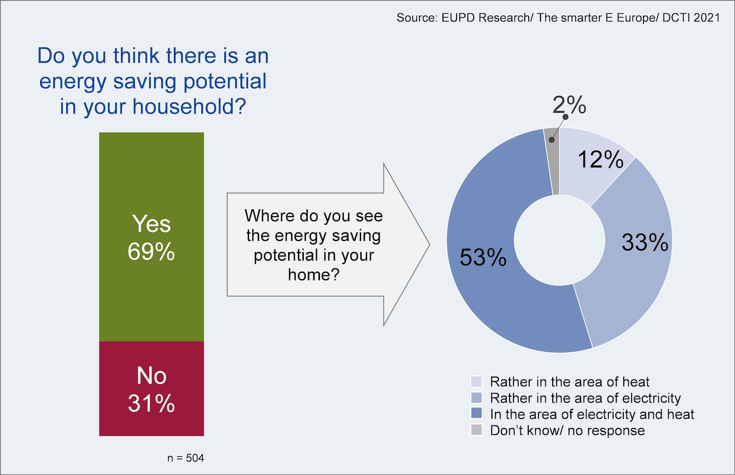 Besides the switch to renewable energies, the efficient use of energy offers a large potential for the success of the energy transition. With respect to energy saving potentials in private households, the majority of survey participants – namely 69% – state to know about their potential to save energy. About 50% of interviewees name electricity and heat consumption as areas with saving potentials. One-third sees more energy saving potential regarding electricity consumption, while 12% see a stronger potential in the area of heat consumption.