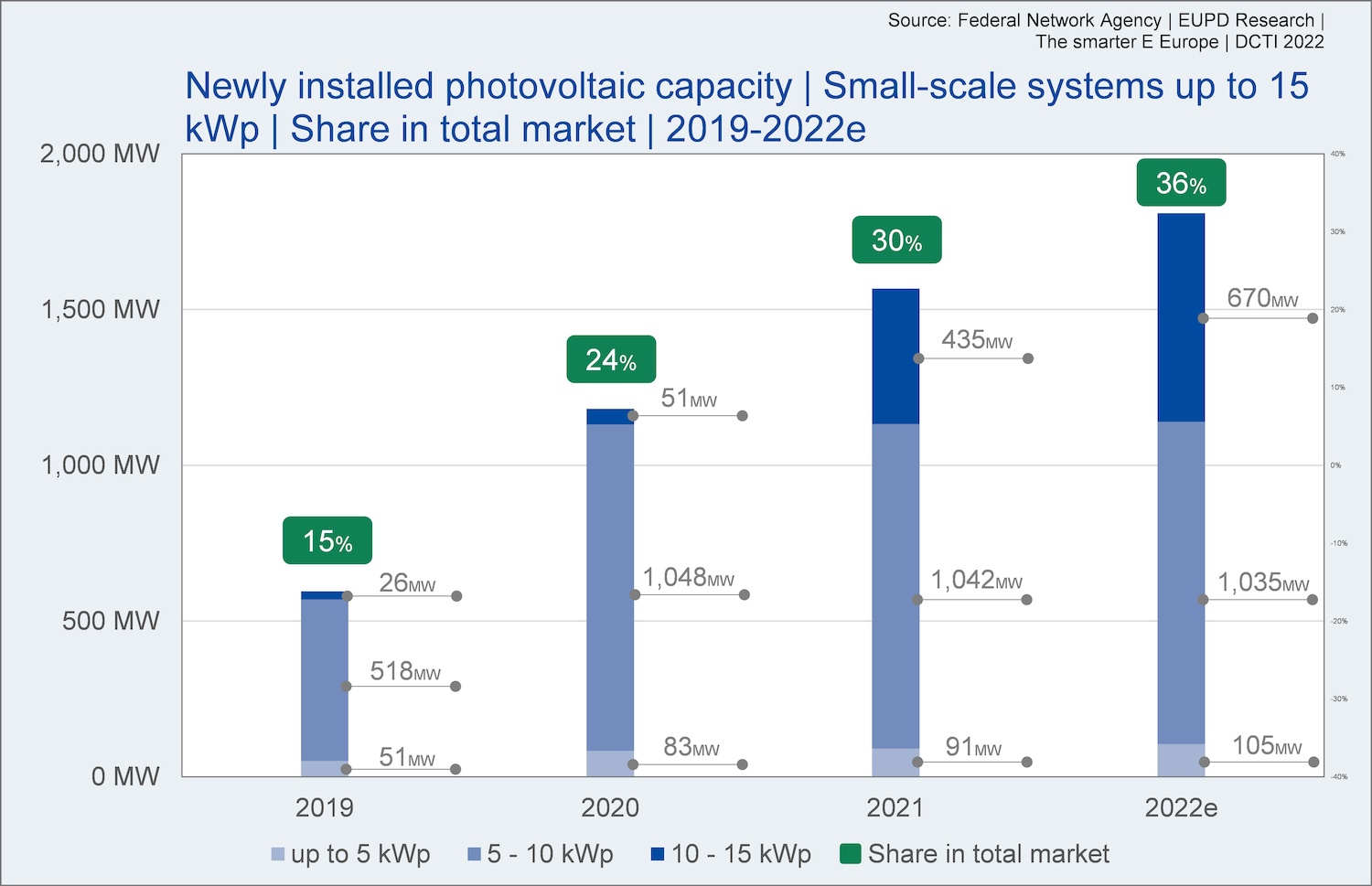 Bonn. Soaring energy prices, growing environmental awareness as well as the increasing electrification of heat and mobility drive photovoltaic installations. Following the record year 2021 with 1.6 GW of small-scale PV system up to 15 kWp, Bonn-based consulting company EUPD Research forecasts an increase of 1.8 GW in this segment for the current year. In 2022, 10-15 kWp systems are especially expected to grow, while installations between 5-10 kWp continue to stagnate. As in previous years, the relevance of the German small-scale segment continues to increase in 2022. In 2021, 30% of PV systems in Germany had a capacity up to 15 kWp; 2022 the share is anticipated to increase to 36%.