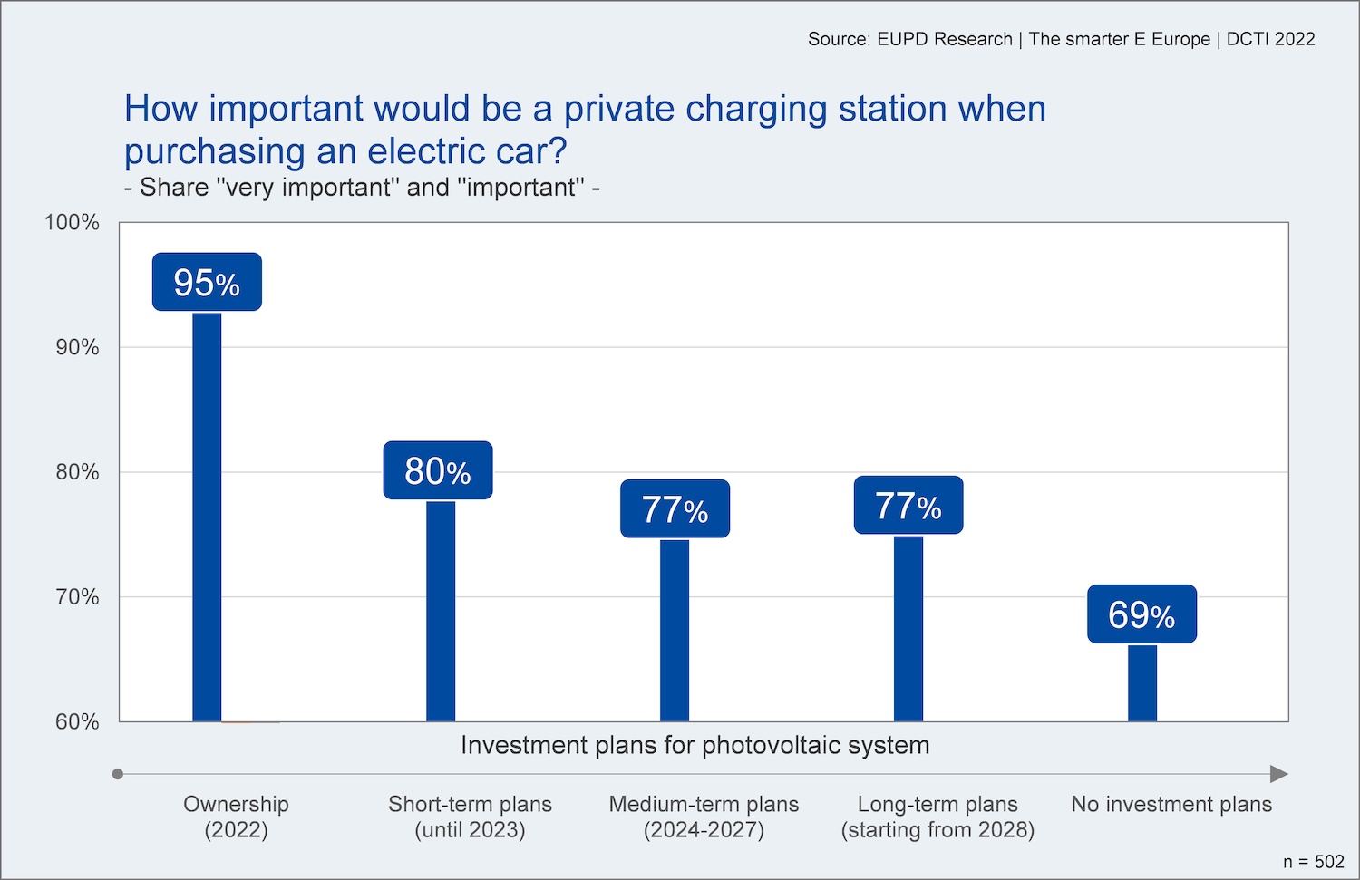 The markets for small-scale photovoltaic systems and electric cars are growing quickly. A recent EUPD Research analysis reveals how an acquisition of a solar system can foster the purchase of an e-car. The more a household engages with PV systems, the more important the investment in an own charging station for e-cars becomes. This is the result of an analysis in the context of this year's Energiewende Award for energy suppliers. The Award will be presented to the most innovative energy suppliers of the DACH region at the innovation platform „The smarter E Europe“ on May 12, 2022.