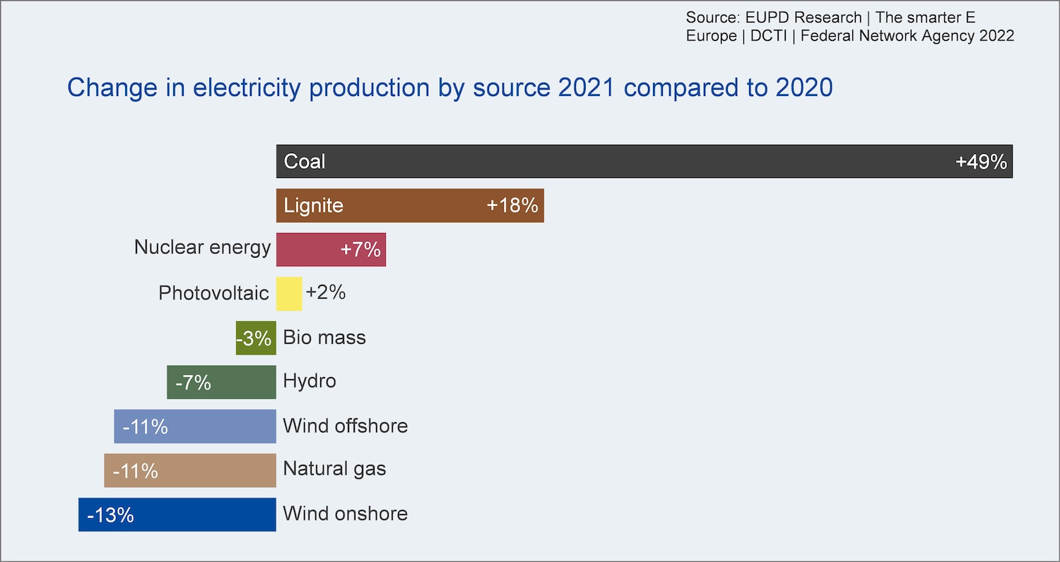 Latest analyses of the year 2021 show an increase of electricity production and demand compared to 2020. Because of unfavorable wind conditions in 2021, the onshore wind energy fell short with only 87% of 2020 electricity production levels. The increased energy demand was especially met by energy production based on coal and lignite power plants. Because of the electrification of mobility and heat an additional, significant rise in demand can be expected. EUPD Research already projects a electricity gap of 37 TWh according to a recent analysis in the context of this year's Energiewende Award for energy suppliers. The Award will be presented to the most innovative energy suppliers of the DACH region at the innovation platform „The smarter E Europe“ on May 12, 2022.
