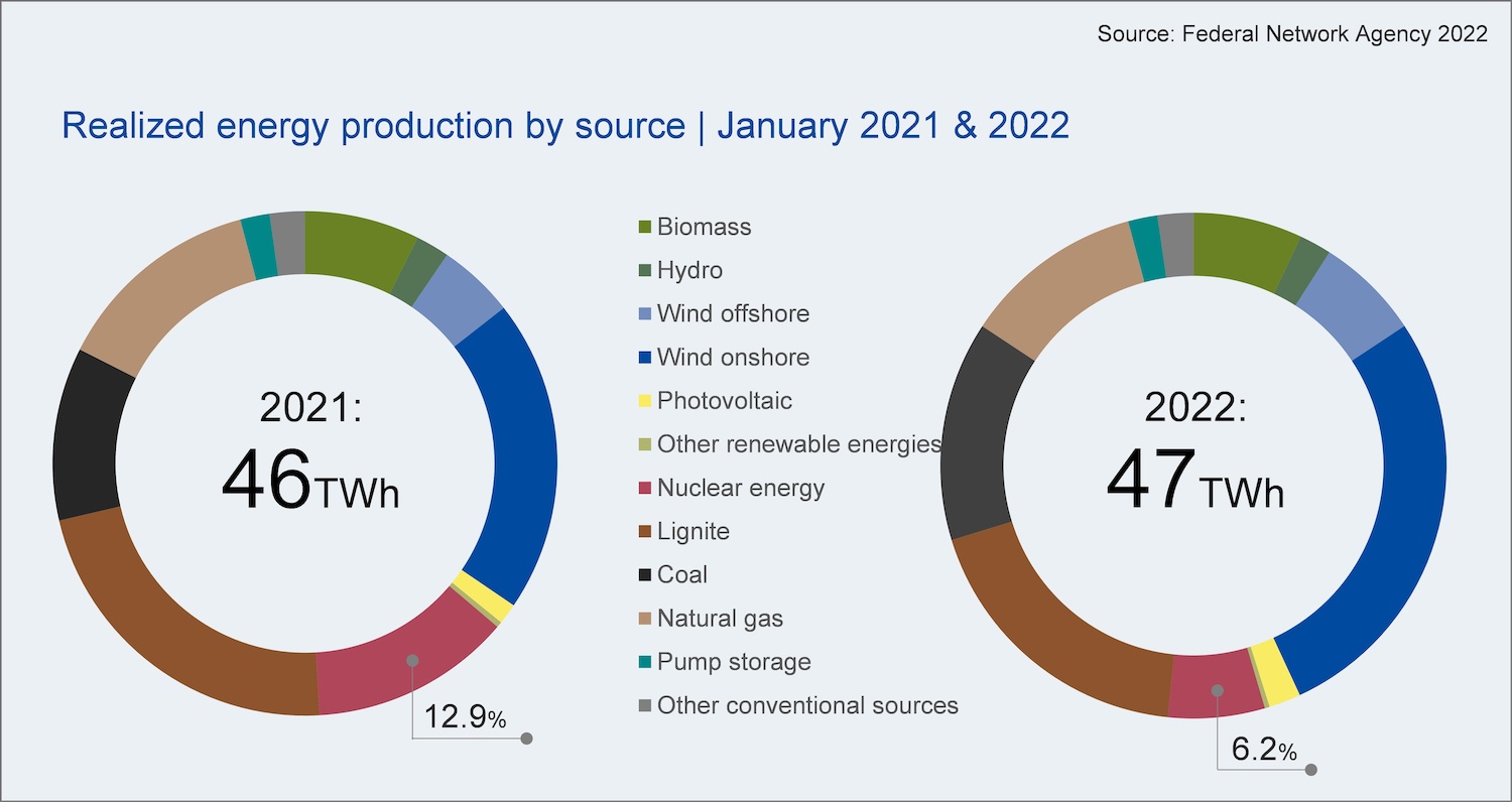 The data for January 2022 clearly shows the penultimate step of the nuclear phase-out. While the nationwide energy production in January 2021 and 2022 had been at similar levels with 46 and 47 TWh, the shutdown of three nuclear power plants is clearly visible at the turn of the year. Accordingly, the share of nuclear energy in electricity supply fell by more than half from 13 percent in January 2021 to six percent in the current year. A monthly comparison shows that renewable energies were able to compensate for the decrease in nuclear energy; they contributed 28 percent more electricity compared to the corresponding month the year before.