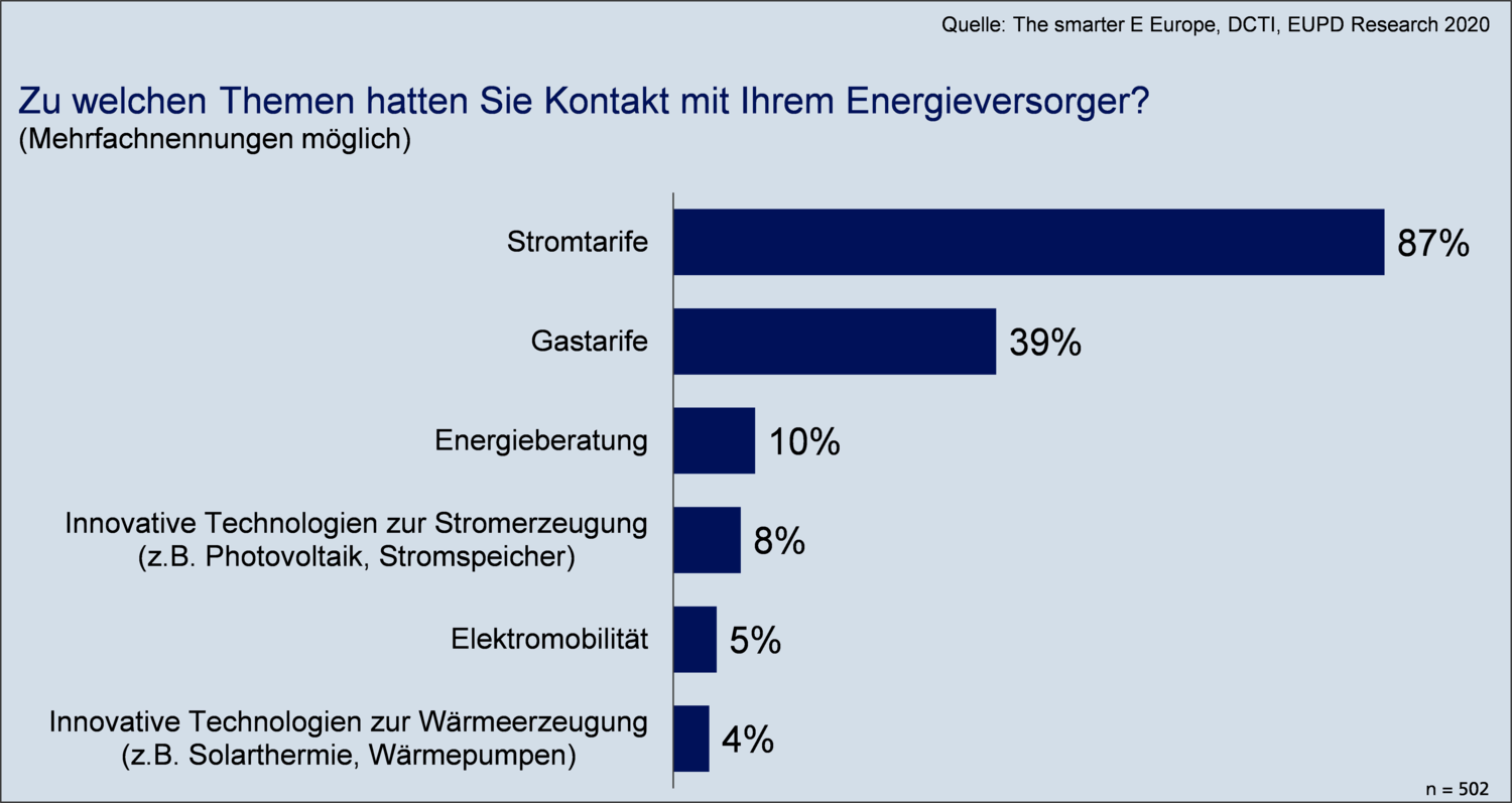 A comprehensive product and service portfolio with respect to energy transition, is barely found among energy suppliers in the DACH region. The success of new products needs active customer address. As revealed by the latest survey of Bonn-based market and economic researcher EUPD Research, communication between private end consumers and energy suppliers almost exclusively focuses on traditional topics such as electricity or gas tariffs. Innovative technologies for electricity or heat generation as well electric mobility make up only four to eight percent of communication between energy suppliers and end consumer.