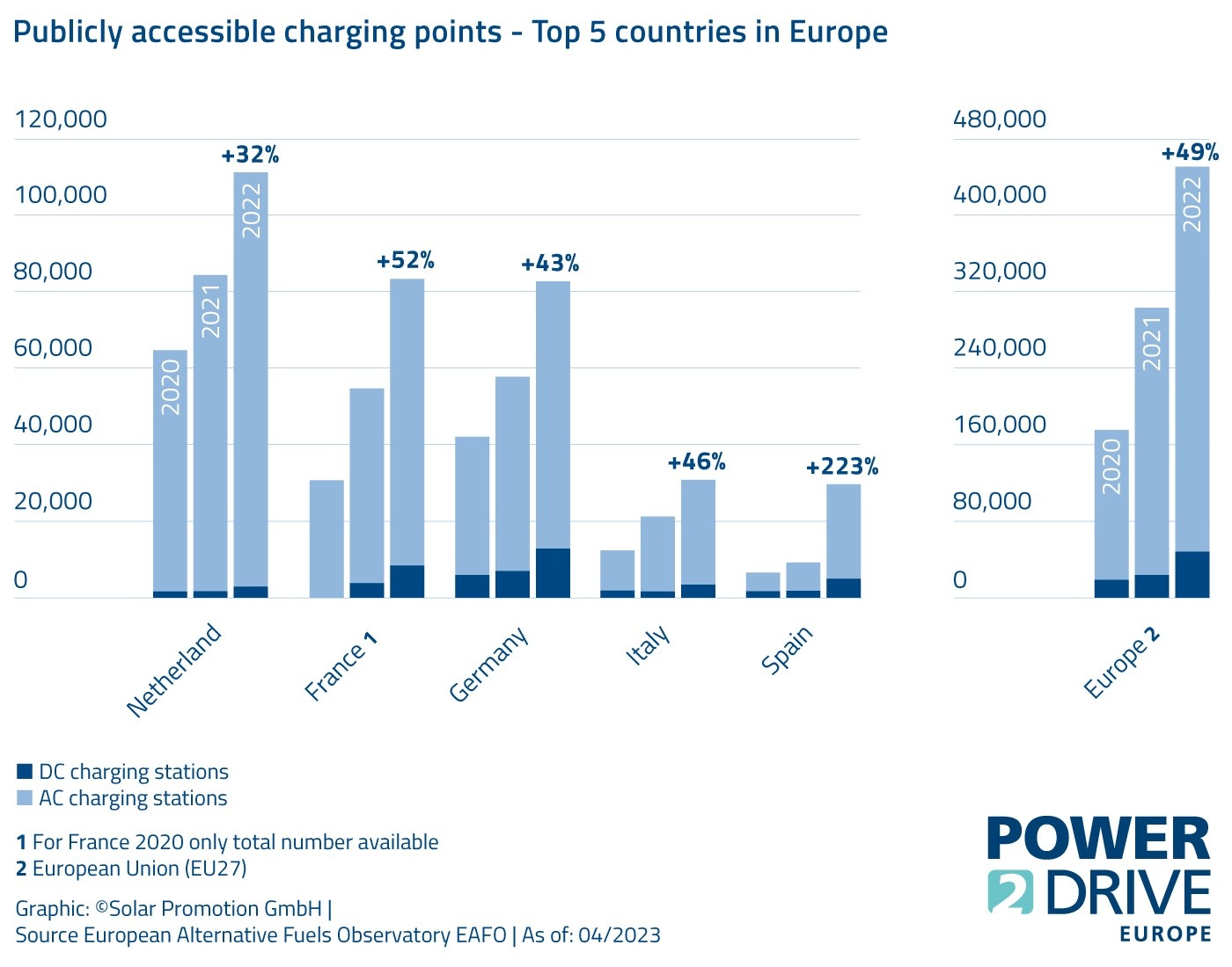 Munich/Pforzheim, April 19, 2023 – Electromobility will not be successful without a comprehensive charging infrastructure. Europe continues to make progress with deploying charging points. No country has as many publicly accessible charging stations as the Netherlands. Germany, the frontrunner in public fast charging infrastructure, almost caught up to France in 2022. However, to achieve the goal set by the German government (2030: 1 million charging points) and the European Union (2030: 3.5 million), deployment must accelerate. At Power2Drive Europe, visitors can learn how this could be accelerated. More than 250 companies will be presenting their latest products and solutions at the international exhibition for charging infrastructure and e-mobility. Power2Drive Europe is part of The smarter E Europe and will take place from June 14–16, 2023 at Messe München. A total of more than 2,200 exhibitors are taking part and over 85,000 visitors are expected.