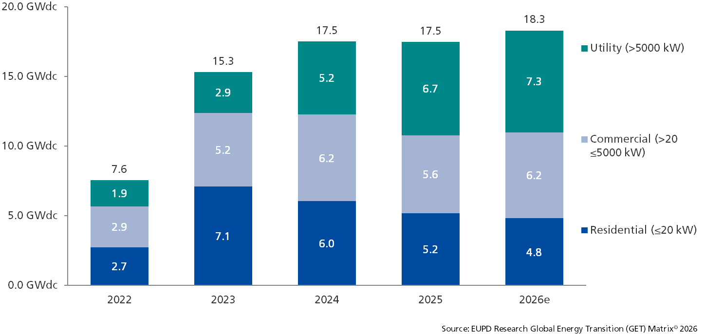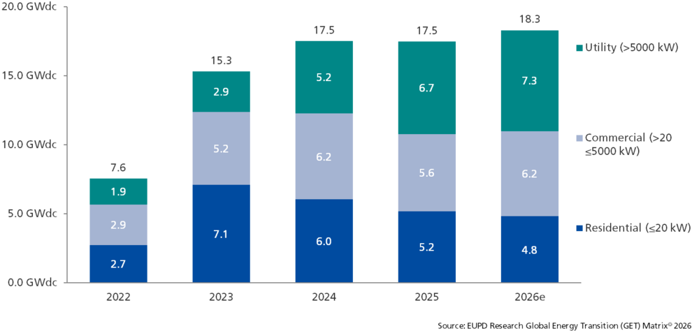 In Germany, the concept commonly referred to as 'Tenant electricity' (Mieterstrom in German)[3] has so far played only a limited role in the overall market and has primarily been confined to specific use cases in multi-family housing. Rather than representing a dominant driver today, it can be understood as an early and relatively narrow implementation of localised consumption concepts. With the introduction of regulatory provisions for energy sharing under the Energiewirtschaftsgesetz (§ 42c EnWG)[4], effective from June 2026, locally generated renewable electricity is expected to be shared more broadly across multiple participants, enabling more scalable and system-oriented applications beyond individual buildings, although its market impact will need to be observed over time. By contrast, the C&I segment continues to outpace other segments in driving market growth. In 2025, C&I installations accounted for approximately 5.6 GWdc, representing around one-third of total new PV capacity in Germany[5].