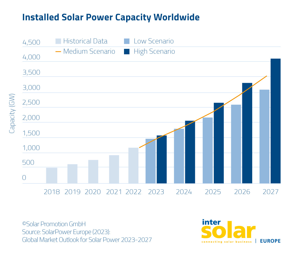 Munich/Pforzheim, July 27, 2023 – The global solar industry is ready for a revolution, with all signs pointing to growth. Recently, at the Intersolar Europe Conference 2023, the European industry association SolarPower Europe presented the latest edition of its Global Market Outlook for Solar Power 2023–2027 . The market study shows that in 2022, the worldwide PV market has hit a new growth record with a deployment of 239 gigawatts of newly installed capacity. For the current year, the association expects the installed capacity to grow by around 341 gigawatts. These figures have the industry looking forward to the next Intersolar Europe with optimism. Visitors can learn everything worth knowing about the trends, business models and innovations at the world’s leading exhibition for the solar industry in Munich from June 19–21, 2024. Intersolar Europe is part of The smarter E Europe, Europe’s largest platform for the energy industry, and takes place alongside ees Europe, Power2Drive Europe and EM-Power Europe.
