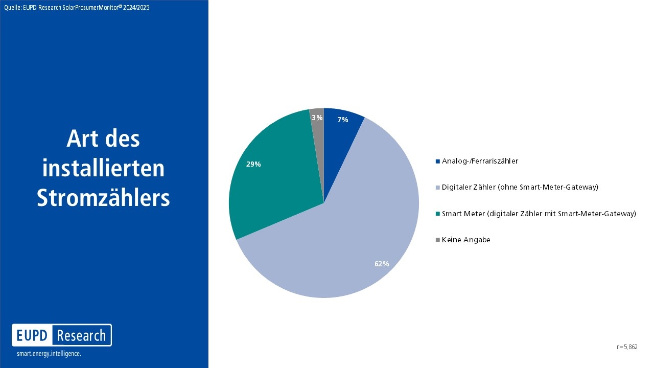 Erkenntnisse aus dem Solar Prosumer Monitor© 2024/2025 von EUPD Research verdeutlichen den Umfang der Aufgabe. Während 29 Prozent der mehr als 5.800 befragten Hauseigentümer bereits intelligente Zähler nutzen, setzen 62 Prozent noch auf digitale Zähler ohne Gateways (Quelle: EUPD) . Diese Ergebnisse unterstreichen die Dringlichkeit, den Rollout zu beschleunigen, um die ehrgeizigen Ziele der Energiewende zu erreichen.
