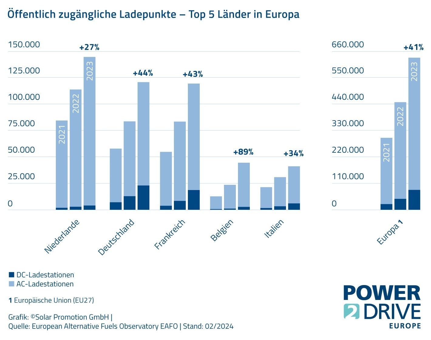 Die mit Abstand beste Ladeinfrastruktur ist derzeit in den Niederlanden zu finden: Mit rund 144.000 öffentlich zugänglichen Ladepunkten (plus 27 Prozent gegenüber dem Vorjahr) übertrifft man den größten EU-Staat Deutschland, der über gut 120.000 solcher Ladepunkte verfügt – dabei leben in Deutschland knapp fünfmal so viele Menschen auf einer rund achtmal so großen Fläche. Der Absatz von batterieelektrischen PKW entspricht dabei ungefähr der Einwohneranzahl: In den Niederlanden wurden im Jahr 2023 rund 113.000 davon neu zugelassen, in Deutschland waren es im gleichen Zeitraum rund 524.000.